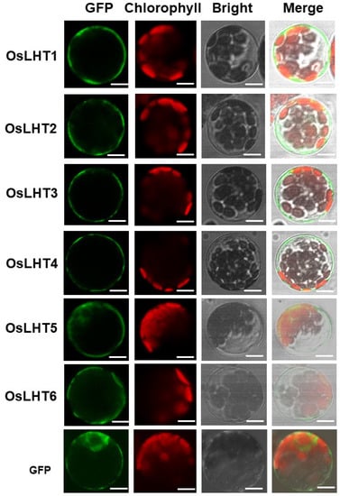 Subcellular localization of OsLHTs in Arabidopsis protoplasts. Abbreviations: GFP, GFP fluorescence image; Chlorophyll, chlorophyll autofluorescence; Bright, bright-field image; Merged, merged bright-field, GFP fluorescence and chloroplast fluorescence images. Free GFP was used as a positive control. Bars = 5 μm.