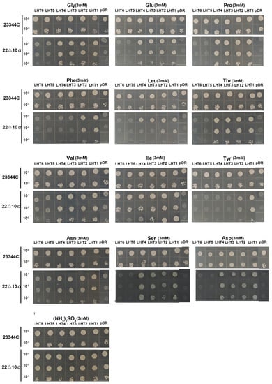 Yeast function complementation experiment. The amino acids acted as the only nitrogen source in the media. The pDR195−OsLHTs and the empty vector pDR195 were transformed into the wide-type strain 23344c and the mutant strain 22Δ10α, respectively. Yeast clones were cultured overnight in a selective medium to OD = 1, then diluted to OD = 0.1, 0.01 and 0.001. Drops of 7 μL were aligned on minimal media with the amino acids as the sole nitrogen source. Images were taken after 7 days of growth at 30 °C.