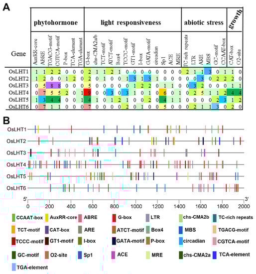 Cis-acting elements identified in the promoter regions of the six OsLHT genes in rice. (A) Information on species and localizations. (B) Information on quantities.