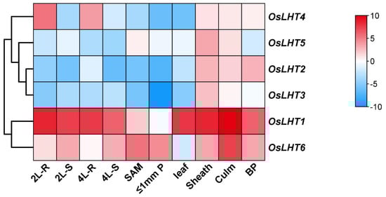 Heat map of the quantitative real-time PCR analysis results for the OsLHT genes at various developmental stages and in various organs, with three biological and technical replicates. The scale above displays the relative signal intensity values. Abbreviations: 4L−R, roots of 4−leaf stage seedlings; 4L−S, 4−leaf stage seedlings; 2L−R, roots of 2−leaf stage seedlings; 2L−S, 2−leaf stage seedlings; 10L−SA, shoot apex of 10−leaf stage seedling; BP, booting panicle; ≤1P, developing panicle with a length of ≤1 cm.