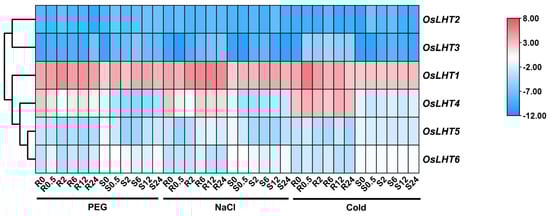 For the abiotic stress treatment (Figure 9 and Figure S5), the OsLHT genes showed different response patterns under PEG, NaCl and cold stress. Following PEG treatment, the transcript levels of OsLHT1 and OsLHT2 were slightly upregulated during early treatment, followed by a decrease in the roots and shoots. The expression of OsLHT3 peaked at 24 h in the roots, while it was highly expressed at 6 h in the shoots. For OsLHT4 and OsLHT5, the expression levels gradually decreased from the initial time point to 2 h in the roots and 6 h in the shoots. The expression of OsLHT6 was initially upregulated to high levels at 0.5 h and then downregulated in the roots and was gradually downregulated in the shoots. Following NaCl treatment, three genes (OsLHT1, OsLHT2 and OsLHT6) showed slight changes in expression levels in both the roots and shoots. OsLHT3 reached its peak during the initial (0.5 h) treatment, followed by a decrease in expression during the subsequent treatment for the shoots. By contrast, the expression of OsLHT3 was the lowest at 2 h, with a gradual increase at all later time points for the roots. The expressions of OsLHT4 and OsLHT5 were strongly downregulated at 0.5 h in both roots and shoots. Under cold stress, there were three genes (OsLHT4, OsLHT5 and OsLHT6) that exhibited minor changes in expression levels in both roots and shoots at all time points. For the roots, OsLHT1 and OsLHT3 were obviously upregulated; their expression levels peaked at 0.5 h and 6 h. For the shoots, only the expression of OsLHT2 exhibited obvious upregulation, at 0.5 h.
