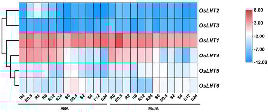 Heat map of the quantitative real−time PCR analysis results of the OsLHT genes in roots and shoots under MeJA and ABA treatments, with three biological and technical replicates. The scale above displays the relative signal intensity values.