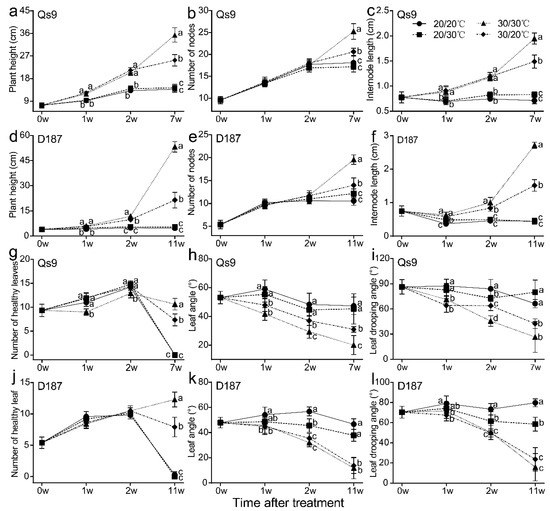 Figure 3). This finding indicates that the heat-stress treatment of the belowground parts of the potato plants induced a significant feedback-regulation effect on the morphological characteristics of the aerial plant parts only after an extended period (7 and 11 weeks). In addition, compared with the Qs9 plants, the EH- and AH-treated D187 plants had no significant difference in basic leaf angle or leaf drooping angle during the long-term treatment (7 and 11 weeks) (