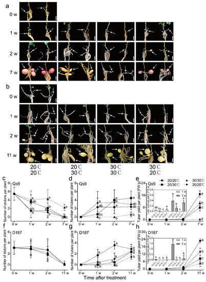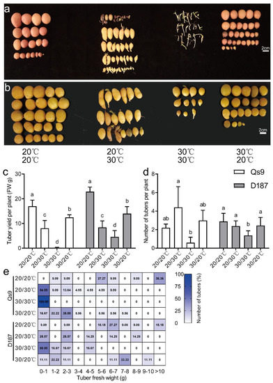 Figure 5a,b). These findings demonstrate that although potato plants can form tubers at high temperatures by independently maintaining a suitable temperature for their aerial parts or belowground parts, tuber growth is better maintained if the belowground parts are kept at a suitable temperature. In addition, compared with the Qs9 plants, the D187 plants formed tubers under the EH treatment, and the number of tubers per plant under the EH treatment was only slightly different from those of the other three treatments (