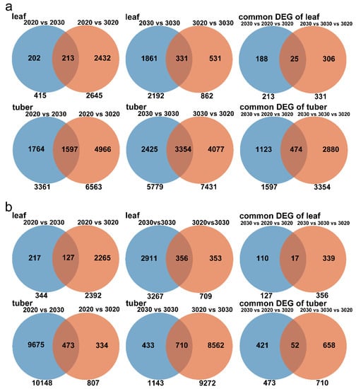 On day 14 of the treatment, the fourth lowest leaf and the newly formed tubers (or stolons) of the plants were collected, nine plants were randomly selected from each treatment group, and three plants were mixed as a biological replicate. The sampling time was noon on day 14 of the treatment (i.e., after 6 h of illumination). The samples were quickly frozen in liquid nitrogen, 100 mg portions were taken for total RNA extraction by the TRIzol method, and the purity and the concentration of RNA were assessed with a Nanodrop ND-2000 instrument (Thermo Scientific, Allentown, PA, USA). Qualified RNA samples were delivered to Shanghai Applied Protein Technology Co., Ltd. (Shanghai, China) for cDNA library construction and sequencing on the NovaSeq6000 sequencing platform.