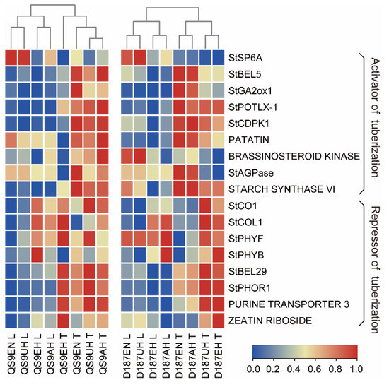 StSP6A expression in the tubers of the UH-treated Qs9 and D187 plants was significantly lower than that of the EN-treated plants; there was no significant difference between