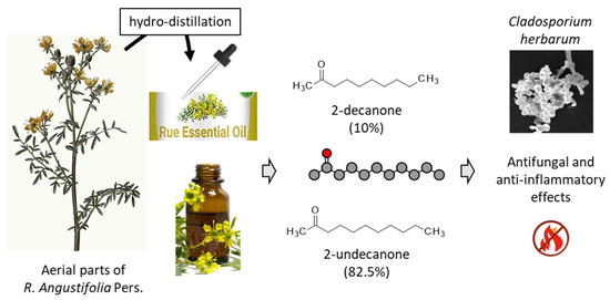 Figure 2. An essential oil manufactured from the aerial parts of Ruta angustifolia Pers. contained essentially 2-ketone derivatives, principally 2-undecanone and 2-decanone, which display antifungal and anti-inflammatory properties [6,16].