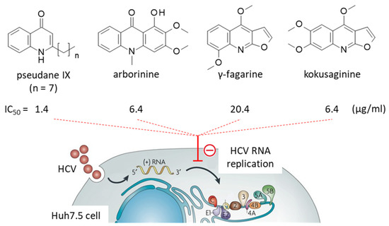 21. Wahyuni, T.S.; Widyawaruyanti, A.; Lusida, M.I.; Fuad, A.; Soetjipto; Fuchino, H.; Kawahara, N.; Hayashi, Y.; Aoki, C.; Hotta, H. Inhibition of hepatitis C virus replication by chalepin and pseudane IX isolated from Ruta angustifolia leaves. Fitoterapia 2014, 99, 276–283. [Google Scholar] [CrossRef]