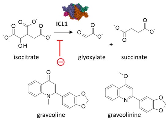 Figure 4. Graveoline is an inhibitor of isocitrate lyase 1 (ICL1) from the fungus Candida albicans [19]. The enzyme catalyzes the cleavage of isocitrate to succinate and glyoxylate. The analogue graveoline is not active against ICL1 but displays antiangiogenic properties. These two quinoline alkaloids can be found in Ruta species, including R. angustifolia Pers.