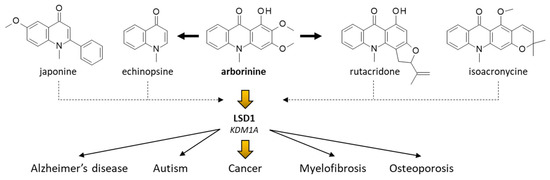 Remarkably, the compound was shown to exert a significant antitumor effect in vivo, in two xenografted murine model of gastric cancer (with SGC-7901 cells sensitive or resistant to adriamycin). At the oral dose of 40–80 mg/kg, arborinine reduced tumor growth in mice, without causing any apparent toxicity [60]. By the same token, very recently arborinine has been shown to suppress ovarian cancer development through inhibition of LSD1. The blockade of LSD1 leads to an increased expression of methylated histone H3K4m1 in SKOV3 ovarian cancer cells, thereby reducing the migration and invasion capacities of the cells due to a blocked EMT [61]. The effect is not specific to ovarian cancer cells because the LSD1 enzyme (also known as lysine (K)-specific demethylase 1A, or KDM1A) is present and frequently overexpressed in many cancer cell types. Recently, it was demonstrated that arborinine can block LSD1/KDM1A activity in clear-cell renal cell carcinoma ccRCC cell lines, sensitive or resistant to the kinase inhibitor sorafenib. In this case again, the compound blocked cell migration and invasion, cell cycle progression, and induced apoptosis [62]. A molecular modeling analysis suggested that arborinine could bind directly to the active site of LSD1, and blocks downstream signaling activities, notably the expression of the ubiquitin-conjugating enzyme E2O (UBE2O), an important protein for cancer cell survival and proliferation [62]. The observation that arborinine represses LSD1/UBE2O signaling in ccRCC opens novel perspectives for research. Firstly, in terms of drug design, it opens a field of research to discover other lysine demethylase inhibitors with an acridone or quinolin-4-one moiety. There exist many naturally-occurring analogues of arborinine, such as evoxanthine, rutacridone, quinolactacins A-C, (iso)acronycine, melicopicine and others tri/tetracyclic products. Bicyclic products derived from echinopsine shall be considered as well, notably the panel of 1-methylquinolin-4-one alkaloids such as eduline, japonine and others (Figure 6). Secondly, in terms of clinical applications, LSD1/KDM1A is aberrantly overexpressed in several cancer types, with different LSD1 inhibitors currently developed to treat solid tumors and hematological malignancies [63,64,65]. The antitumor activity of arborinine shall be investigated using a variety of experimental models, to define the optimal conditions and the most suitable applications in humans. Thirdly, outside oncology, LSD1/KDM1A is an enzyme of interest to treat pathologies such as myelofibrosis [66], autism [67] and other diseases [68]. The targeting of LSD1 with arborinine may have broad therapeutic implications; recently, Merck paid US$1.35 billion for LSD1 inhibitors [69]. Parenthetically, another mechanism of action has been evoked with arborinine: the binding to heme leading to a reduction of oxidative stress and inflammation [70]. However, the heme binding affinity is weak (Ka = 3.9 × 104 M−1) compared to the level of LSD1 inhibition. Nevertheless, arborinine exhibits anti-inflammatory activities. It is able to reduce the production of nitric oxide (NO) in activated macrophages [71].