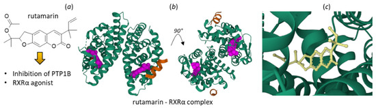Figure 7. (a) Structure of rutamarin and (b) its binding to human retinoic X receptor alpha (RXRα). The alkaloid (purple) is bound to the protein dimer (green), in the presence of a SRC1 peptide (orange). (c) A close-up view of rutamarin in the RXRα active site (from PDB structure 3PCU) [78].