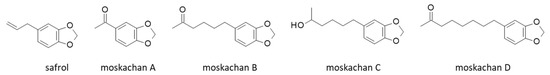 A relatively rare series is called moskachans A-D, four benzodioxone derivatives (Figure 9), discovered initially from the aerial part of R. angustifolia [105] and later found in R. chalepensis [106]. The name moskachan comes from ‘moskatxa’, the Basque name for R. angustifolia [105] but also used for other Ruta species. Moskachan B is not cytotoxic whereas moskachan D displays a weak antiproliferative activity against A549 lung cancer cells (IC50 = 74.4 μM) [13]. In addition to these four moskachans, other compounds with a methylenedioxyphenyl moiety have been identified from an essential oil of R. angustifolia (from a specimen collected in Malaysia), including compounds structurally close to safrol which is a well-known phenylpropene derivative [107] (Figure 9). Moskachans have been occasionally found in other species but rarely studied. They could be further considered as ingredients in the food or perfumery industry, as it is the case for other compounds with a methylenedioxyphenyl moiety.