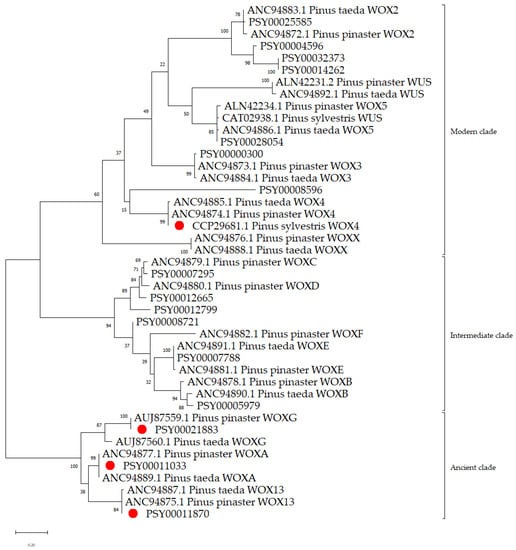 - Alvarez, J.M.; Bueno, N.; Cañas, R.A.; Avila, C.; Cánovas, F.M.; Ordás, R.J. Analysis of the WUSCHEL-related homeobox Gene Family in Pinus Pinaster: New Insights into the Gene Family Evolution. Plant Physiol. Biochem. 2018, 123, 304–318. [Google Scholar] [CrossRef]