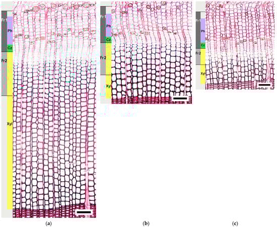 - Antonova, G.F.; Stasova, V.V. Seasonal Development of Phloem in Scots Pine Stems. Russ. J. Dev. Biol. 2006, 37, 306–320. [Google Scholar] [CrossRef]