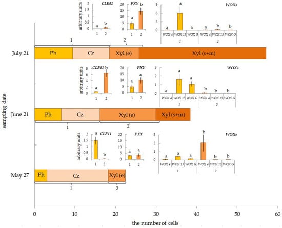 - Galibina, N.A.; Moshchenskaya, Y.L.; Tarelkina, T.V.; Chirva, O.V.; Nikerova, K.M.; Serkova, A.A.; Semenova, L.I.; Ivanova, D.S. Changes in the Activity of the CLE41/PXY/WOX Signaling Pathway in the Birch Cambial Zone under Different Xylogenesis Patterns. Plants 2022, 11, 1727. [Google Scholar] [CrossRef] [PubMed]