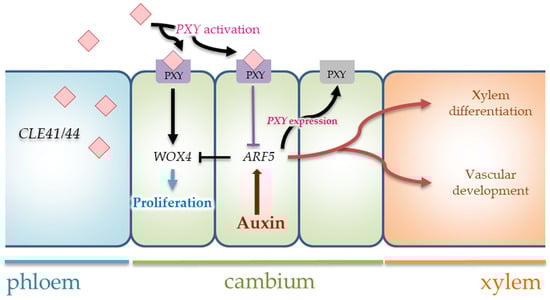 - Etchells, J.P.; Smit, M.E.; Gaudinier, A.; Williams, C.J.; Brady, S.M. A Brief History of the TDIF-PXY Signalling Module: Balancing Meristem Identity and Differentiation during Vascular Development. New Phytol. 2016, 209, 474–484. [Google Scholar] [CrossRef] [PubMed]