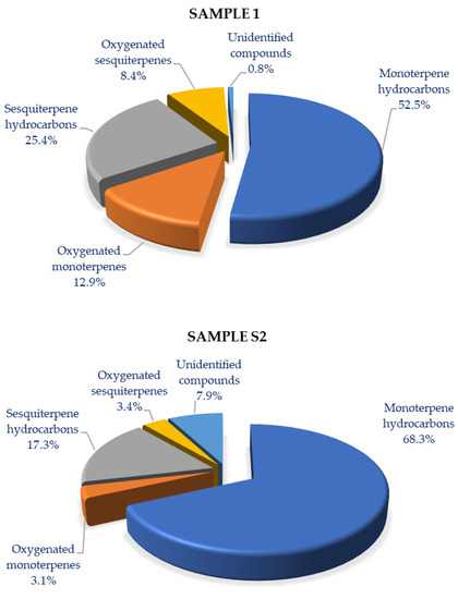 It might be noticed that, in both S. sipylea Greek samples, monoterpene hydrocarbons were the dominant class in the studied EOs (Figure 1) and their content was 68.3% in S2 and 52.5% in S1. The fraction of the rest of the terpenoid classes was higher in the mid-summer S1 sample, while this difference was mostly notable in the case of oxygenated monoterpenes (12.9 versus 3.1% for S1 and S2, respectively). It might be also referred that the content of unidentified compounds was higher in the early summer S2 sample than in the mid-summer S1 sample (7.9% versus 0.8%, respectively).