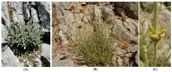 As S. sipylea (Figure 3) is considered an Endangered plant in Greece [36], parts of the above-ground shoots of 10–15 individuals of S. sipylea were hand-collected with caution from wild-growing populations on Mt Kerkis, Samos Island (Sample S1, at 1300 m above sea level) and on Mt Olympus, Lesvos Island (Sample S2, at 950 m above sea level), representing the most northern (Lesvos Island) and the most southern (Samos Island) distribution limit of S. sipylea at the eastern part of the Aegean Archipelago, Greece. Sample S1 was collected at the peak of the flowering period (mid-July 2014), while sample S2 was collected during early summer, at the beginning of the flowering period (mid-June). In both cases, the plant material used for the analysis was almost equally harvested from different individuals, thus making the collection pressure exerted during sampling almost equivalent to the routine grazing effect by herbivores and leaving untouched all basal leaves and meristems in harvested plant individuals to allow new seasonal vegetative growth. Both samples (S1, S2) were taxonomically identified, and voucher specimens were deposited at the TAU Herbarium (Laboratory of Systematic Botany and Phytogeography, Department of Botany School of Biology, Aristotle University of Thessaloniki, Greece) with duplicates at the Herbarium of the Balkan Botanic Garden of Kroussia (BBGK in Index Herbariorum), Institute of Plant Breeding and Genetic Resources, Hellenic Agricultural Organization Demeter.