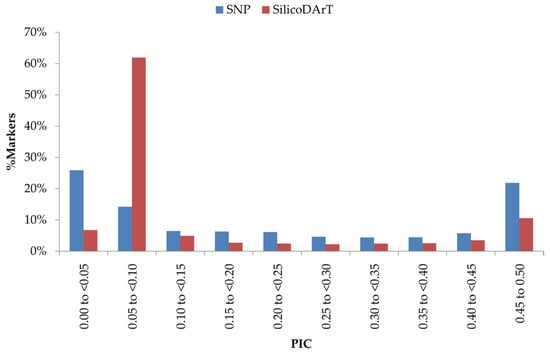 In total, 31,420 SilicoDArT markers were selected for the study. Among these informative markers, around 9% were observed in PIC class 0.45 to 0.5 and 50% in the 0.05 to 0.1 class (Figure 1). The PIC values of the remaining markers were distributed almost equally (2–5%) across the rest of the marker groups. The median (0.05) was located close to the average PIC value of 0.14 (Table S3).