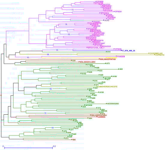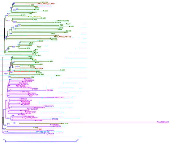 The genetic dissimilarity among accessions estimated through SilicoDArT markers ranged from 0 to 1 (Table S7). CV-Chicote (ssp. sesquipedalis) from Cape Verde was, as expected, isolated in a branch (Figure 3). However, the other out-group sample, F. vagem from Portugal, scored far from CV-Chicote and close to two accessions from Angola (Figure 3) in a branch shared by Mozambican accessions. Lardosa1A, an important Portuguese landrace, scored among Portuguese samples but on an isolated branch. Only Frade scored even further. Satão, however, is clearly similar to most Portuguese accessions. An additional branch groups the reference accession with the breeding lines IT1069 and IT1263, Portuguese CP560 and A14 and A49 from Mozambique. SilicoDArT did not discriminate between BPGV2535, BPGV 5514 and BPGV914 or between CP4906, CP5814 and BPGV6160.