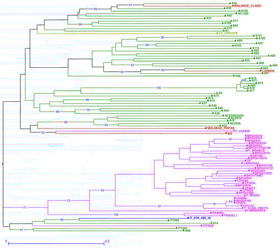 There are 58% of Mozambican landraces that are pure, spread across three subpopulations (29% red, 17% green and 11% blue). All the other landraces were admixed. Several landraces from the agroecological region R7, described by Gomes et al. [4] (A71, A74, A76, A77 and A80), have no admixture and are clustered in subpopulation blue (Figure 7, Table S10).