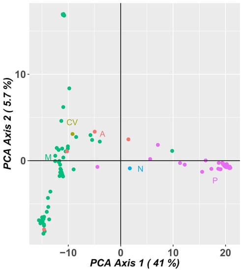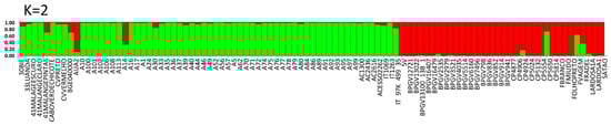 - Pritchard, J.K.; Stephens, M.; Donnelly, P. Inference of Population Structure Using Multilocus Genotype Data. Genetics 2000, 155, 945–959. [Google Scholar] [CrossRef]
