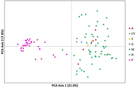 The samples from Mozambique may be grouped into three different clusters. The landraces A76, A78 and A80 (upper left side of the graph), sampled at the agroecological zone R7, described by Gomes et al. [4], are the most distant from all the other samples from Mozambique.