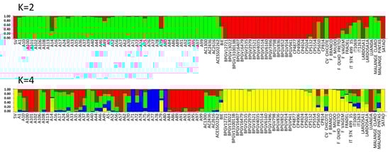 Population STRUCTURE of 92 cowpea accessions using SilicoDArT marker data as estimated using the model-based Bayesian algorithm implemented in the STRUCTURE program. Proportion of assignment of individuals to K = 2 and K = 4 subpopulation groups. Each accession is represented by a vertical line. Vertical lines with only one color (higher than 80%) were considered pure accessions.