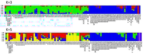 Population STRUCTURE of 92 cowpea accessions using SNP marker data as estimated using the model-based Bayesian algorithm implemented in the STRUCTURE program. Proportion of assignment of individuals to three and five population groups. Each accession is represented by a vertical line. The distribution of the accessions to different populations is indicated by the color code. In the blue right side are all the Portuguese accessions and on the other side are the PALOP samples. Vertical lines with only one color (higher than 80%) were considered pure accessions.