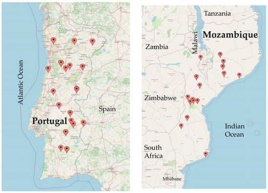 Locations of Portuguese and Mozambican accessions used in this study (https://www.mapcustomizer.com/, accessed on 9 February 2023).