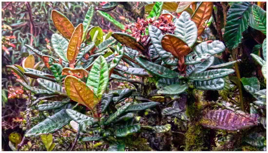 Botanically (see Figure 1), G. rugulosa is a shrub growing up to 2 m tall, with compressed-quadrangular branches and tomentosa, blackish brown in color. The leaves are opposite and petiolate, with an acute apex, rounded, or sometimes subcordate-rounded base, and yellowish tomentose underside, with pinnate venation. The plant presents sub corymbose, compound inflorescence at the apex of the terminal branches. This species only grows in shrubby Paramos, sharing the same ecosystem of typical families such as Melastomataceae, Asteraceae, Orchidaceae, and Ericaceae [20].