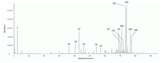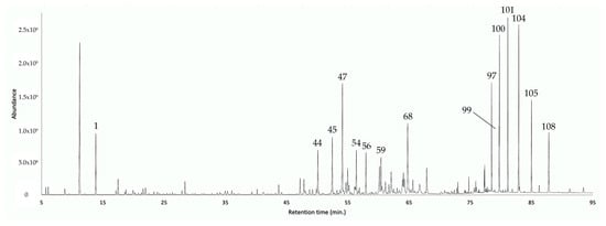 The chemical analyses were carried out through two orthogonal columns, affording reciprocally consistent results. Most of the components identified through the nonpolar column were confirmed on the polar one, with few exceptions for some minority compounds. According to our experience, this is not an unusual phenomenon, due to the higher baseline that is sometimes observed with polyethylene glycol stationary phases. As a result, the total quantitative analysis on the nonpolar column resulted a little higher than the one with the polar stationary phase (93.0% vs. 87.3%). This discrepancy is actually acceptable if we consider that it was a 6% difference, spread over 112 compounds. On the other hand, the polar column permitted to separate some constituents that were physically inseparable with the nonpolar phase. Among them, a major compound, corresponding to peak 99, was included.