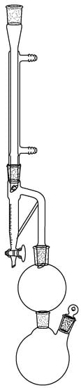 The dry, whole leaves were analytically steam-distilled in a glass Marcusson-type apparatus, where the plant material was placed in a separated reservoir, installed between the water heater and the condenser. The bottom of the collection tube was connected to the vapor conduct, such that the aqueous phase was recycled during the process (see Figure 4). Moreover, the collection tube was refrigerated, to avoid overheating of the EO. A volume of 2 mL of cyclohexane, containing n-nonane as an internal standard (0.70 mg/mL), was placed over the aqueous phase in the collection tube. With this configuration, the condensed vapors passed through the cyclohexane layer before collection, and the EO was concentrated in the organic phase. The distillation was repeated four times, for 4 h each, obtaining four samples of EO in cyclohexane, which were directly injected into GC (injection volume: 1 μL). The four distillations were carried out with 50.3 g, 33.4 g, 33.2 g, and 34.5 g of dry leaves respectively.