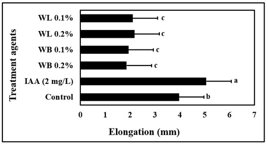 Maize coleoptile elongation rate in seven different solutions: WL, willow leaf extract (0.1% or 0.2% w/v); WB, willow bark extract (0.1% or 0.2% w/v); 2 mg/L of inodole-3-acetic acid (IAA); Control (Water). Different letters indicate significant differences according to Fisher’s protected LSD test (p = 0.05).