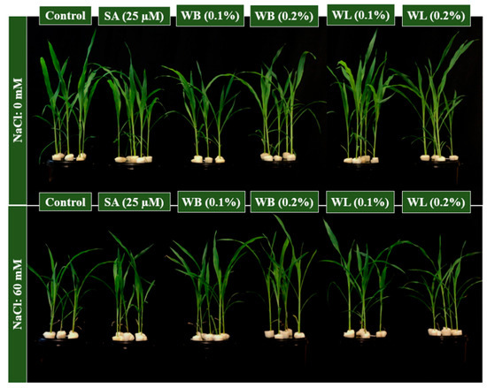 Maize plants were grown under control and saline conditions and the effects of SA, WB and WL extracts were tested in deep water culture (Figure 2). Plants which were grown under saline conditions were smaller when compared to control plants (Figure 2 and Figure 3A,B). At the end of the experiment, among salinity-affected plants, those treated with the experimental biostimulants appeared generally taller (Figure 2).