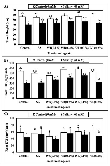 Effect of treatments with various agents (SA, salicylic acid (25 µM); WB, willow bark extract (0.1% or 0.2% w/v); WL, willow leaf extract (0.1% or 0.2% w/v)) on plant height (A), shoot dry weight (DW) (B), root dry weight (DW) (C) of 30-day-old maize (Zea mays cv. Caramelo) plants hydroponically grown in control (0 mM) or salinity stress (60 mM) conditions. Reported data are means of 4 independent biological replicates. Different letters indicate significant differences between means according to Tukey’s HSD test (p < 0.05). For two-way ANOVA results and the HSD scores used to separate the means, see Table 1.