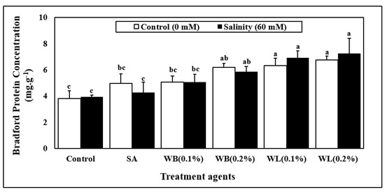 Leaf protein concentration was significantly affected by only biostimulant applications (Table 1, Figure 4). Irrespective of the salinity stress, the plants which did not receive any biostimulant treatment had the lowest protein levels. The SA treatment did not cause a significant increase in the protein levels. The high concentration of WB extract increased the leaf protein concentration by more than 50% on average, whereas the 0.1% WL and 0.2% WL applications resulted in even greater increases in the range of 70–80%.