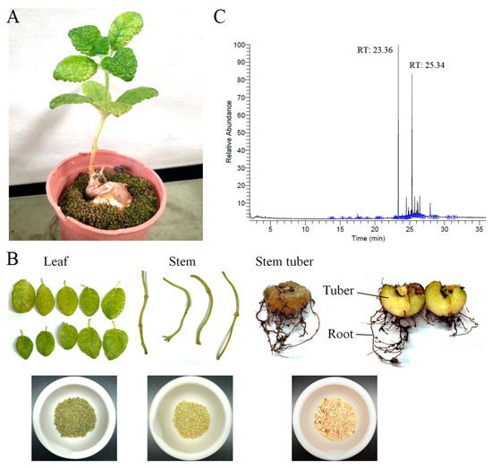 Preparation of different extracts from S. bullata. (A) S. bullata is a tuberous member of the flowering plant family Gesneriaceae. S. bullata has bullate leaves. (B) Various parts of S. bullata, i.e., the leaf, stem, and stem tuber, were collected, dried, cut into small pieces, pulverized into powder, and extracted using water, methanol, ethanol, and acetone to assess whether these extracts have pharmacological potentials. The roots were removed from the tuber and were not involved in this study. (C) GC–MS analysis of the leaf extract obtained by 100% acetone. GC chromatogram of compounds in this extract is shown. Compounds were identified by matching generated spectra with NIST 2011 and Wiley 10th edition mass spectral libraries.