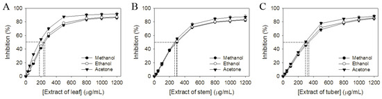 Antioxidant activity of different extracts of S. bullata. The antioxidant activities of extracts from (A) leaf, (B) stem, and (C) tuber prepared using methanol, ethanol, and acetone were evaluated by DPPH radical scavenging assay.