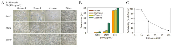 The cytotoxic effect of different S. bullata extracts against B16F10 cells. (A) Trypan blue dye exclusion staining. The cytotoxic effects of different S. bullata extracts against B16F10 cells were estimated with trypan blue assay after 24 h of incubation. The B16F10 cells incubated with Sb-L-A of 100 μg/mL were almost dead. (B) The death rates of B16F10 cells. The anti-B16F10 activity of S. bullata extracts followed the order: leaf > stem > tuber. (C) MTT cell viability assay. Sb-L-A (20, 40, 80, and 100 μg/mL) were added to cell culture medium in a 96-well plate with B16F10 cells (3 × 103). Sb-L-A was found to significantly inhibit B16F10 cells growth in a dose dependent manner with IC50 value of 39.8 ± 1.6 μg/mL.