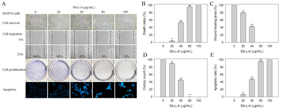 The cytotoxic effects of Sb-L-A against B16F10 cells. (A) Effects on cell survival, migration and proliferation, and apoptosis. (B) Trypan blue dye exclusion staining results. B16F10 cells incubated with Sb-L-A at concentrations of 20, 40, 80, and 100 μg/mL. (C) The wound healing assay. Sb-L-A significantly inhibited cell migration. (D) Clonogenic formation assay results. Pretreatment with Sb-L-A strongly suppressed the proliferation and colony formation of B16F10 cells. (E) Hoechst staining results. Apoptosis induced by Sb-L-A with DNA fragmentation was observed in B16F10 cells. ** p < 0.01 and *** p < 0.001 compared with the control group.
