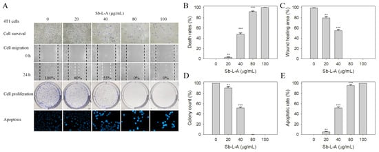 The cytotoxic effects of Sb-L-A against 4T1 cells. (A) Effects on cell survival, migration and proliferation, and apoptosis. (B) Trypan blue dye exclusion staining results. 4T1 cells incubated with Sb-L-A at concentrations of 20, 40, 80, and 100 μg/mL. (C) The wound healing assay. Sb-L-A significantly inhibited cell migration. (D) Clonogenic formation assay results. Pretreatment with Sb-L-A strongly suppressed the proliferation and colony formation of 4T1 cells. (E) Hoechst staining results. Apoptosis induced by Sb-L-A with DNA fragmentation was observed in 4T1 cells. ** p < 0.01 and *** p < 0.001 compared with the control group.