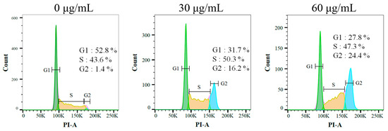 The effect of Sb-L-A against the cell-cycle progression of B16F10 cells was examined by using flow cytometry (Figure 6). The melanoma cells were treated with Sb-L-A at concentrations of 30 and 60 μg/mL. Incubation with Sb-L-A of 30 and 60 μg/mL boosted the distribution of the G2 phase from 1.4% to 16.2% and 24.4% in the B16F10 cells, respectively. Accordingly, Sb-L-A might suppress melanoma cell proliferation by inducing G2 cell-cycle arrest.
