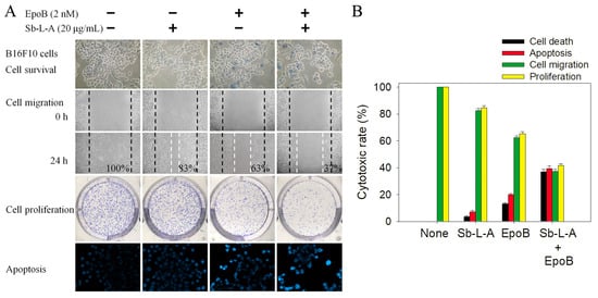 The potential synergistic cytotoxic effects of EpoB with Sb-L-A. (A) Incubation of B16F10 cells with EpoB and Sb-L-A. Sb-L-A (20 μg/mL) and EpoB (2 nM) were co-used to investigate the cytotoxic effects on cell survival, migration, proliferation, and apoptosis. (B) The collective data suggested potential synergistic cytotoxic effects because the co-treatment of Sb-L-A with EpoB could cause more deaths of the cancer cells, further inhibit the migration and proliferation, and produce more DNA fragmentations in B16F10 cells.