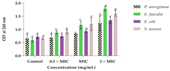 Effect of the whole leaf extract on the release of 260 nm absorbing materials by P. aeruginosa, E. faecalis, E. coli and S. aureus. The different superscripts (a, b, c and d) represent the statistical difference (p < 0.05) per bacterium; similar letters indicate no statistical difference (p > 0.05).