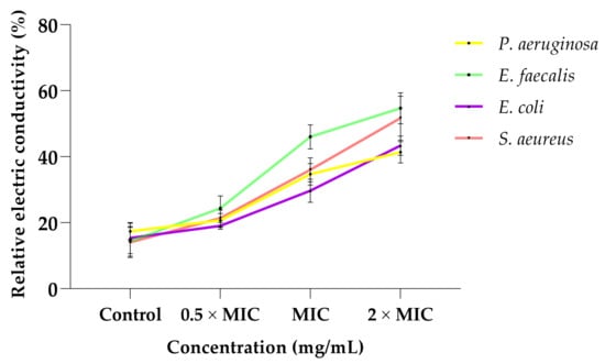 Figure 3 demonstrates the effect of the whole leaf extract on the membrane permeability of the four selected bacteria. The conductivity of the treated bacteria illustrated a dependent relationship, and there was an increase in conductivity observed when the concentration was increased. The highest concentration (2 × MIC) had the maximum conductivities against all bacterial strains. E. faecalis revealed the highest conductivity (54.7%) after being treated with 2 × MIC, while P. aeruginosa had the least relative electric conductivity (41.3%). The control revealed the lowest conductivity.