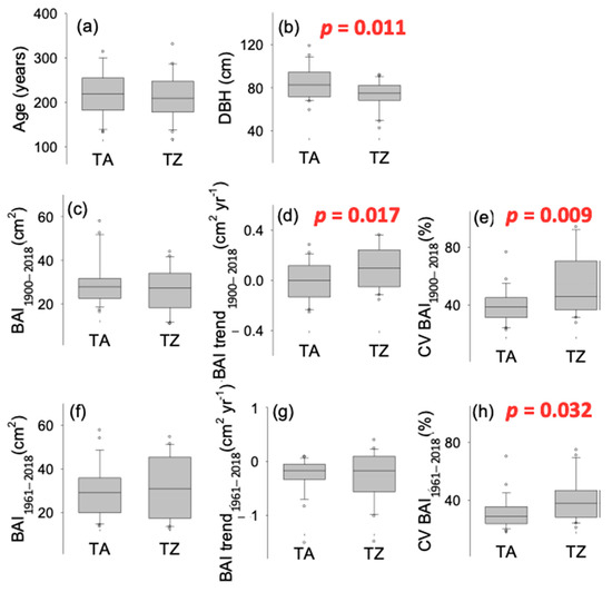 Comparison of tree-scale growth patterns estimated as the basal area increments (BAI) of tree rings obtained in Abies marocana for Talassemtane (TA) and Tazaot (TZ). Tree age (a) was estimated at coring height, according to tree-ring dating. DBH (b) indicates the tree diameter at 1.3 m from the ground. Mean growth was computed comparing the periods 1900–2018 (c) and 1961–2018 (f). BAI trend (d,g) was estimated as the slope of BAI against the time. CV (e,h) indicates the coefficient of variation, estimated as (100*) the ratio of the BAI standard deviation divided by the mean. Significant p-values for ANOVA are indicated.