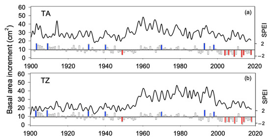 Growth pattern estimated as the basal area increments of tree rings obtained in Abies marocana for Talassemtane, TA (a) and Tazaot, TZ (b) over the period 1900–2020. Lines represent the mean. Bottom bars indicate the summer SPEI, where extreme moist (blue) and drought (red) events are highlighted.