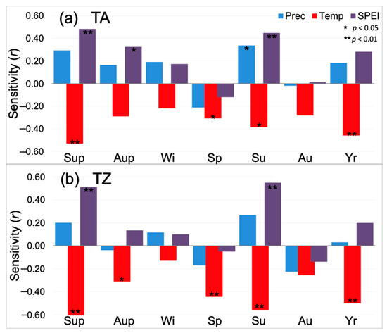 Climate sensitivity (correlation) of mean growth (mean basal area increment) for the period 1961–2018 of Abies marocana trees from Talassemtane, TA (a) and Tazaot, TZ (b) ranges. Sensitivity was tested at seasonal and annual scales for mean temperature (red), total precipitation (blue), and the SPEI drought index (purple). Seasonal scale was defined by mean (sum) of three-monthly scale temperature (precipitation), while seasonal-scale SPEI data were directly obtained from the database using the available three months estimates (noted as SPEI_3); similarly, annual estimates consider the hydrological year (prior September to current August), and the August estimate of SPEI_12 (Yr). Seasons are noted as winter (Wi), spring (Sp), summer (Su), and autumn (Au), including December–February, March–May, June–August, and September–November, respectively. Further, we consider seasonal correlations for summer and autumn of the previous year of tree-ring formation (Sup and Aup, respectively). * and ** indicate significant correlations after Bonferroni correction at a threshold of p < 0.01 and p < 0.05, respectively.