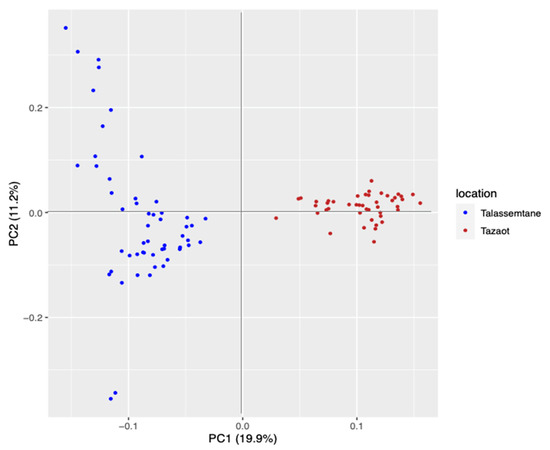 The vcf file obtained in the assembly was filtered, and a total of 98 individuals and 6131 SNPs were maintained. PCA showed two groups: one formed by Talassemtane and the other one by Tazaot (Figure 4). The percentage of explanation of this PCA was 19.9% in the first axis. It is noteworthy that the individuals from Talassemtane displayed high dispersion, while those of Tazaot were more similar to each other. The cross-entropy analysis indicated that K = 2 is the best explanation for the genetic structure of these populations, and the admixture study corroborated this result.